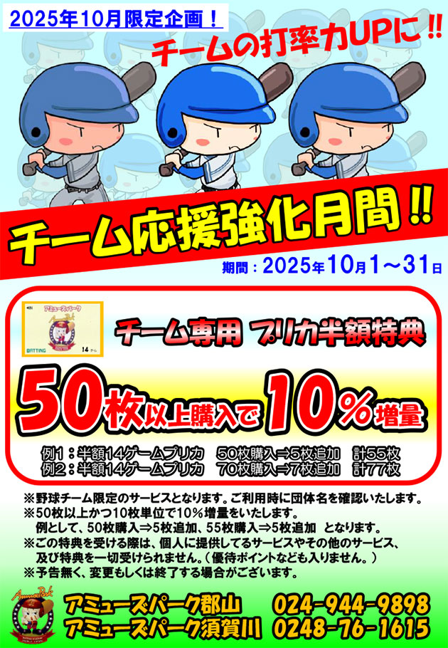 バッティングプリペイドカード半額月間!!チーム特典販売実施!