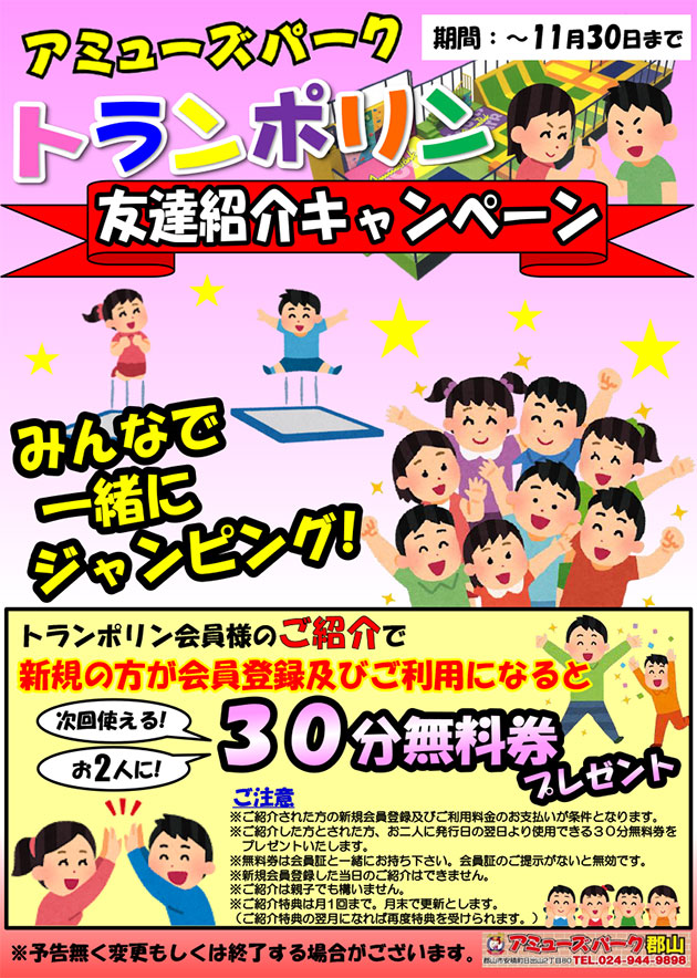 ★みんなで一緒にジャンピング!期間中、友達をご紹介していただくと、次回使える30分無料券をそれぞれにプレゼント!