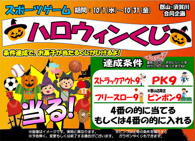 スポーツゲームは4番の的に当てたら、お菓子の当たるクジにチャレンジできちゃう♪どちらもハロウィンの10月31日まで!たくさん遊んでお菓子ももらっちゃおう!