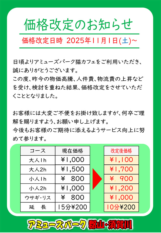 ■11月1日より動物カフェの価格を一部改定させていただきます。