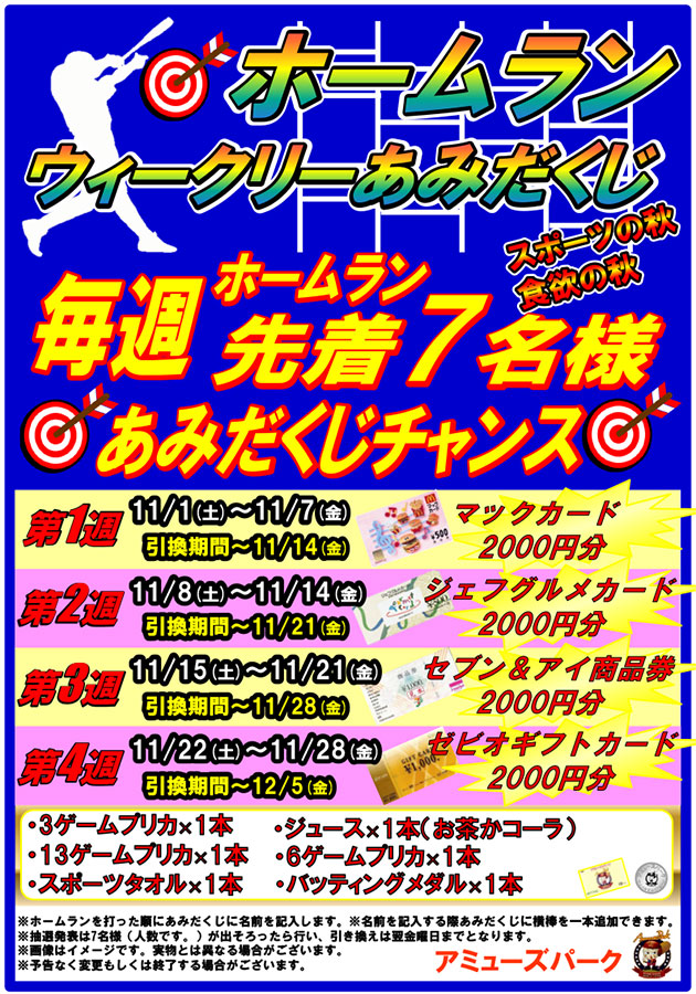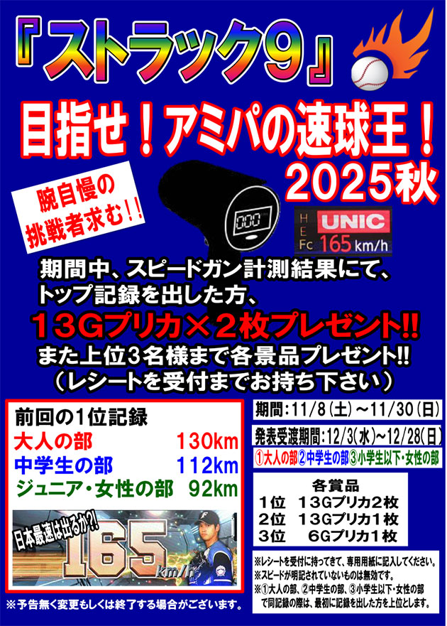 ホームランウィークリーあみだ開催‼ストラック9は秋の速球王開催‼