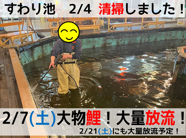 ★すわり池と五目池の掃除をします!掃除の日はその池はご利用できないので、ご注意ください!きれいにした後は、お待ちかねの大放流です!